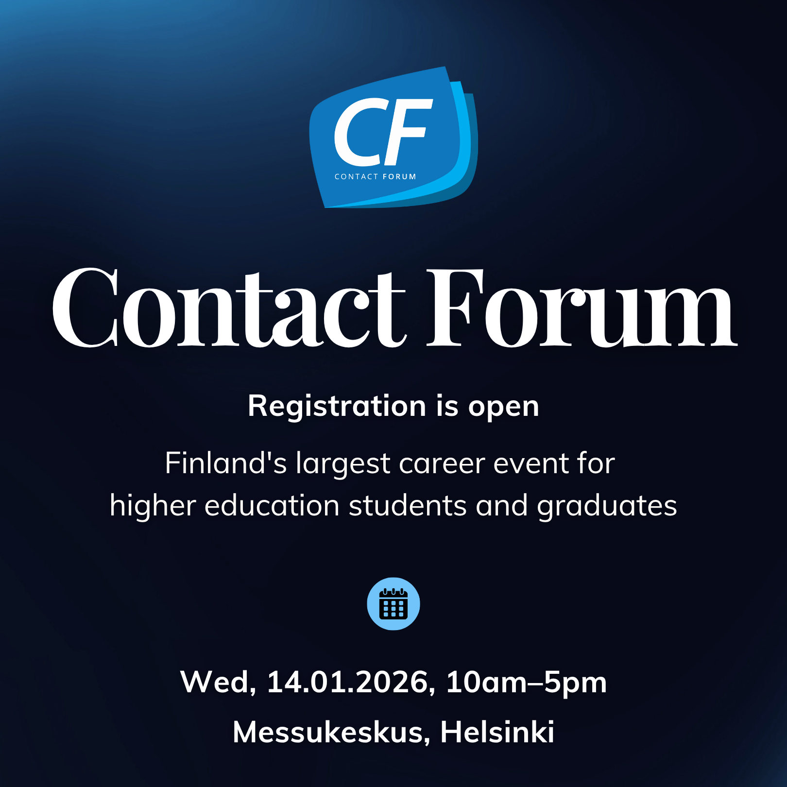 Finland’s largest career event, Contact Forum 2026, gathers over 120 employers at Messukeskus Helsinki on Wednesday 14 Jan, 10:00–17:00. The theme of the year is Jobs & Encounters.