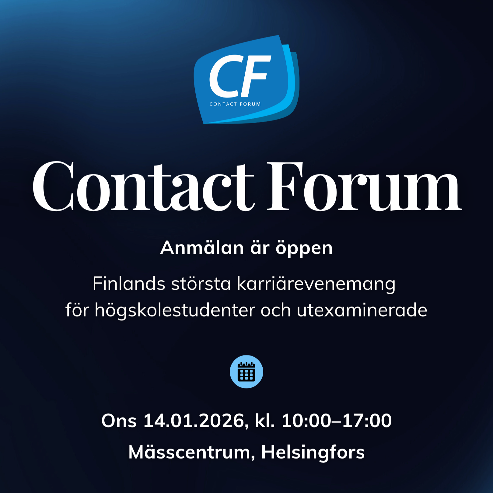 Finlands största karriärevenemang Contact Forum 2026 samlar över 120 arbetsgivare i Helsingfors mässcentrum onsdagen 14.1 kl. 10–17. Årets tema är Jobb & Möten.